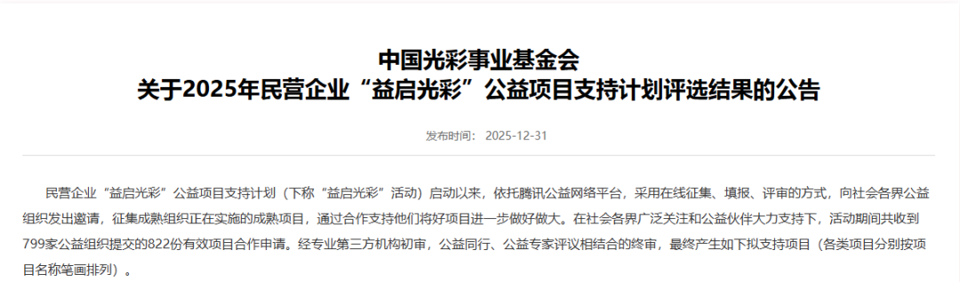 作为备受关注的公益扶持计划,2025 年“益启光彩”公益项目支持计划自启动以来,依托腾讯公益网络平台面向全国征集优质项目,共吸引799家公益组织提交822份合作申请。经过专业第三方机构初审、公益同行与专家评议等多轮严格筛选,最终仅有一批兼具社会价值与实施可行性的项目脱颖而出。
