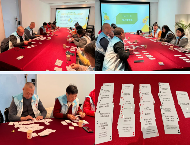 体验式环节成为本次交流会的一大亮点。在徐主任的引导下,志愿者们参与“安心卡” 团体辅导,大家依次选择生命主题卡片,并分享选择它的原因。令人动容的是,在分享最重要的卡片环节,两位志愿者不约而同地选择了那张写着 “我希望有机会道谢、道爱、道歉、道别” 的梅花Q。大家分享生命的情感经历与内心感悟,在坦诚的交流中进一步深化共情能力。