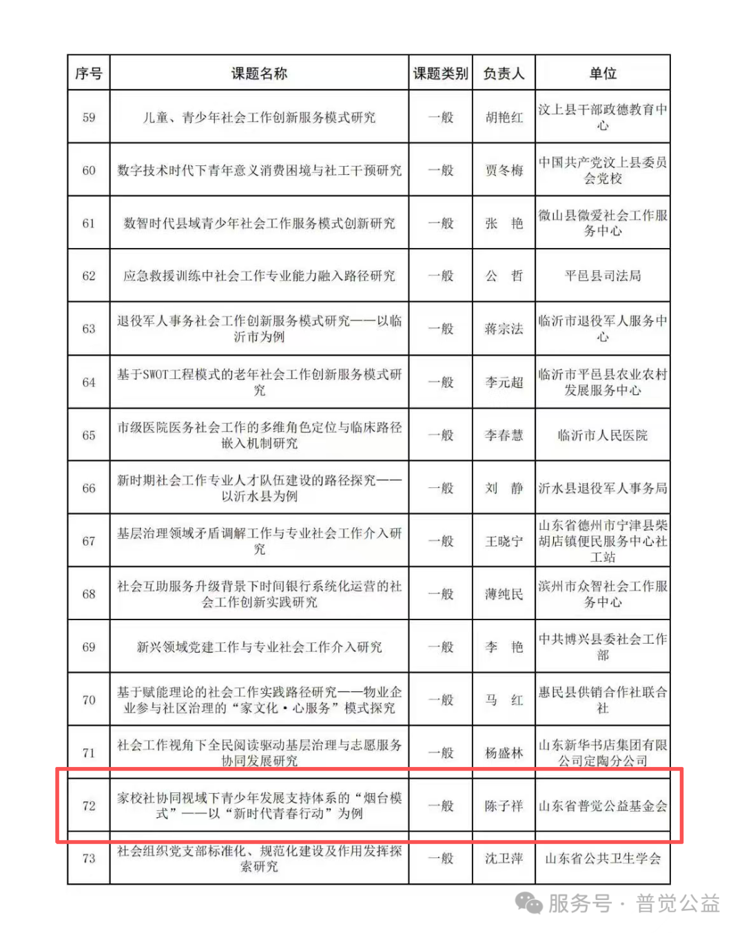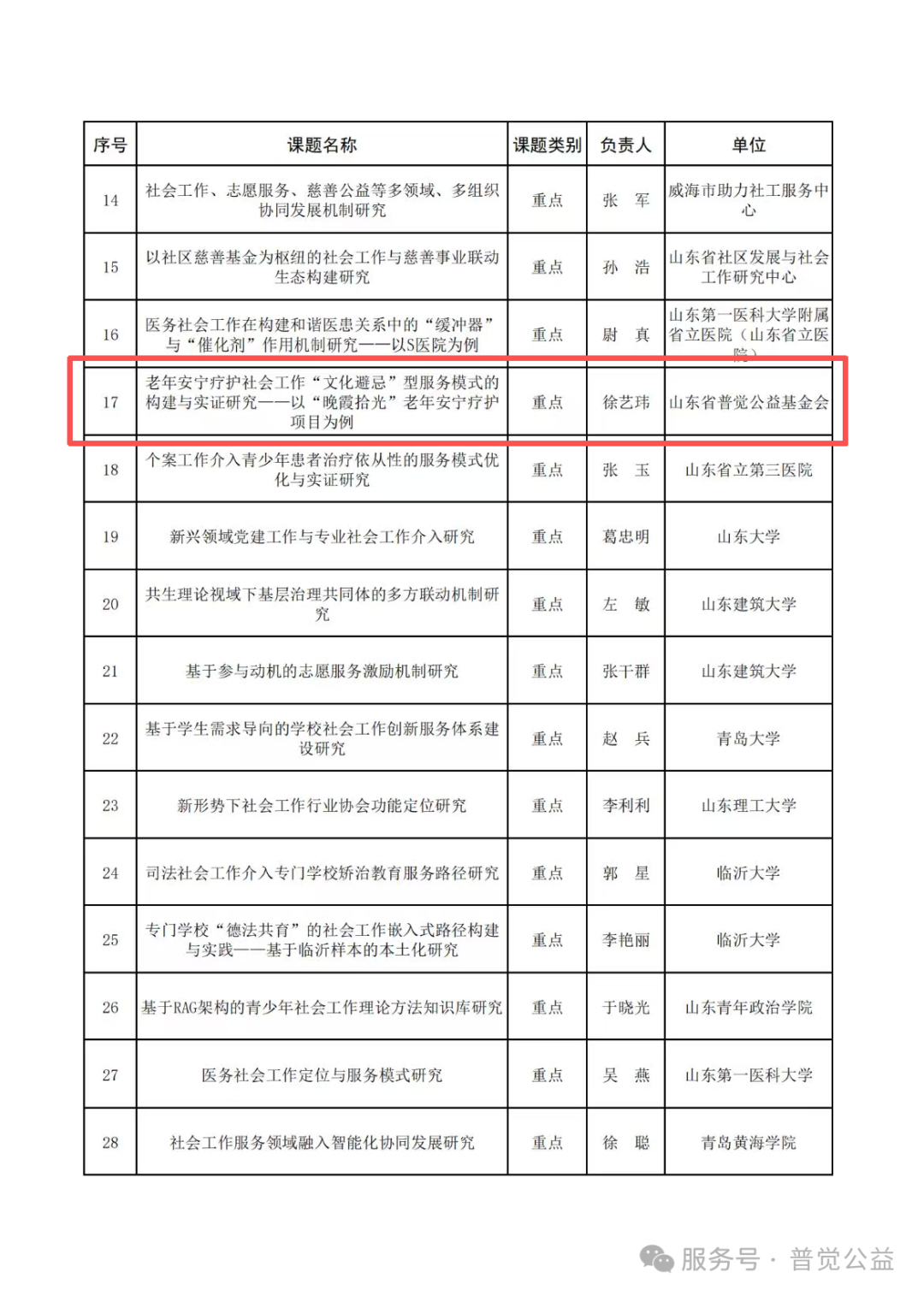 2026年3月9日,山东省社会工作联合会发布2026年度社会工作研究课题拟立项名单公示,经公开征集、自愿申报、立项评审等严格程序,山东省普觉公益基金会申报的“老年安宁疗护社会工作‘文化避忌’型服务模式的构建与实证研究一一以‘晚霞拾光’老年安宁疗护项目为例”和“家校社协同视域下青少年发展支持体系的‘烟台模式’一一‘以新时代青春行动’为例”两项社会工作研究课题成功入选,这是基金会在社会工作理论研究与公益服务实践融合发展领域取得的又一重要成果。