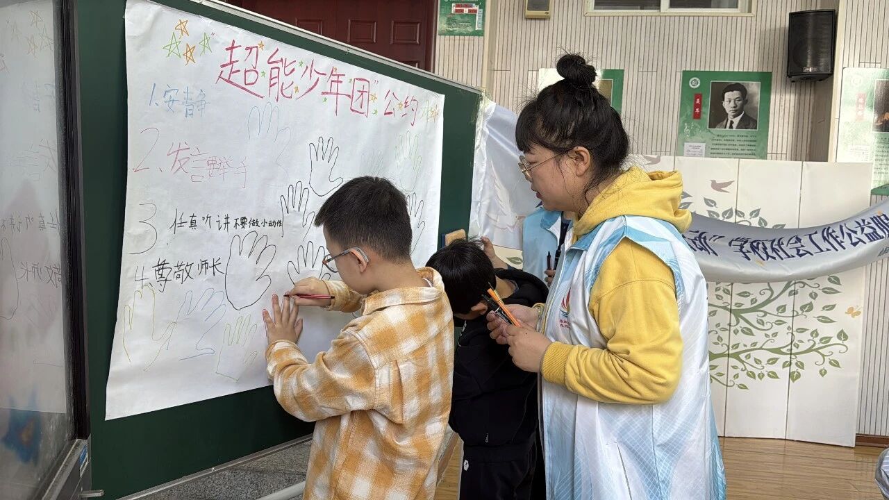在制定超能公约环节,孩子们共同商议、踊跃提出团队规则,如安静、尊敬老师、积极发言等,并将公约郑重张贴在教室,为团体搭建起安全温暖的成长港湾,也在实践中学会尊重差异、包容他人。